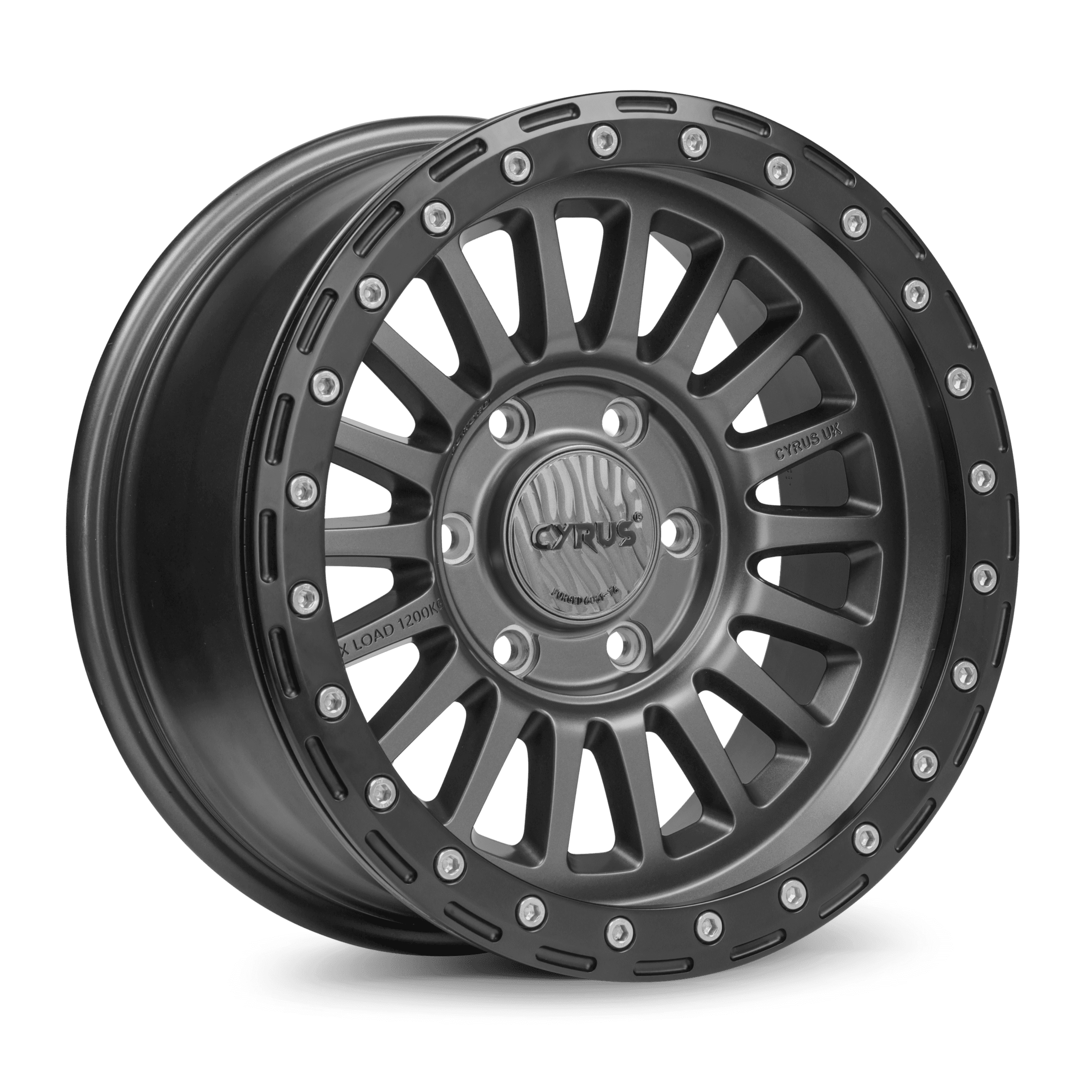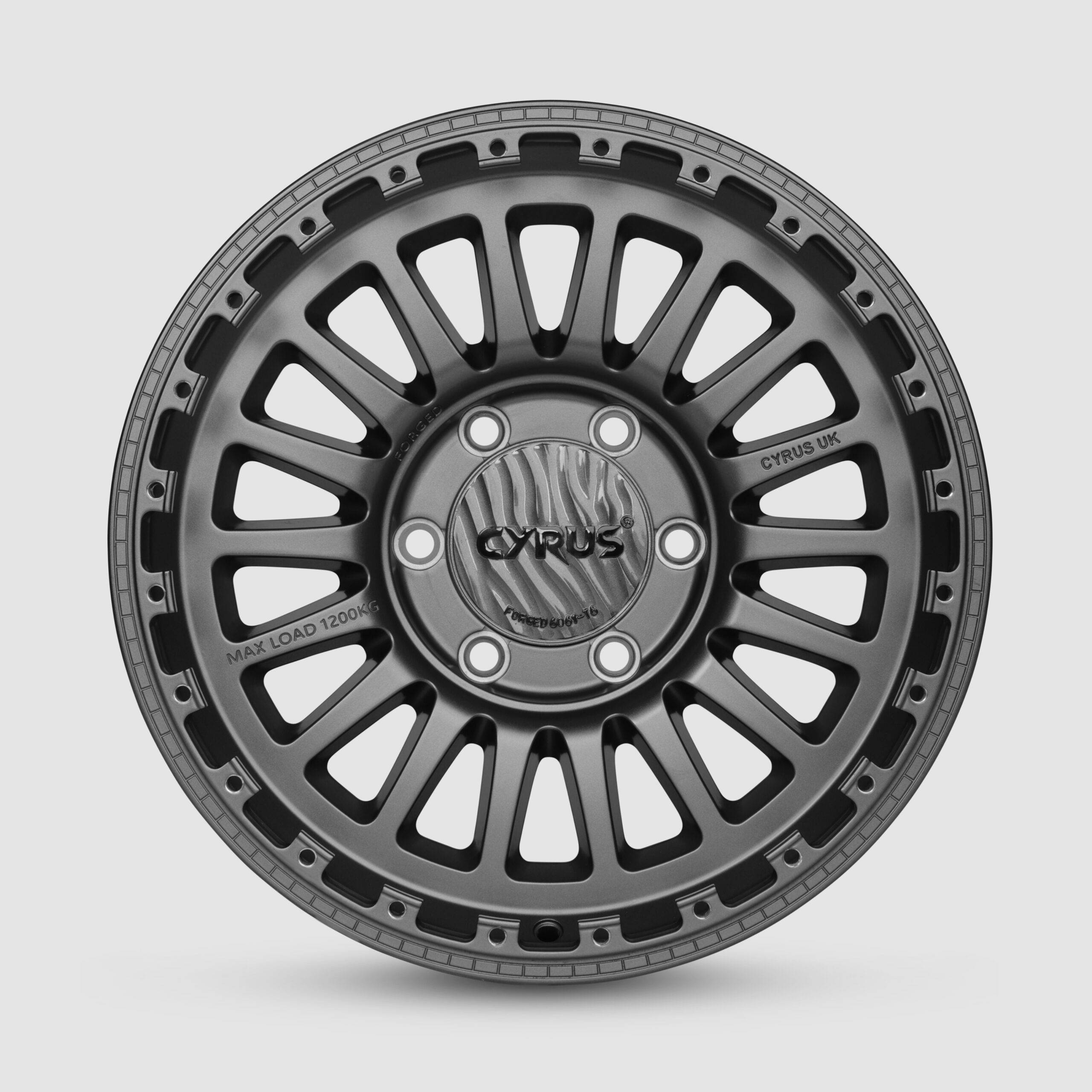 The STRATOS wheel features a durable two-piece forged construction with a dynamic multi-spoke design and a signature matte gray face in CYRUS finishes. A multi-screwed outer ring enhances beadlock performance, while the bolt-on cap ensures maximum hub clearance.